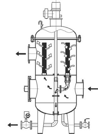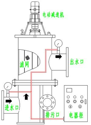 電動(dòng)濾水器過濾工作原理圖如下右圖所示,水源從進(jìn)水口進(jìn)入電動(dòng)濾水器,當(dāng)水中雜質(zhì)通過網(wǎng)芯時(shí),雜質(zhì)