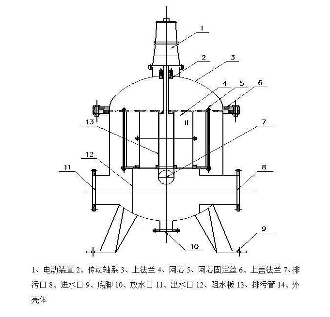 濾水器產(chǎn)品一般由殼體、濾芯部分、進水口部分、出水口部分、排污口部分等五大部分組成,自清洗式濾水器,如全自動濾水器、電動濾水器、工業(yè)濾水器、全自動過濾器等,加裝了電動減速機部分、電氣控制部分,可實現(xiàn)自動清洗、自動排污(定時排污和壓差排污)、故障報警等功能。濾水器構(gòu)造圖如下圖所示。